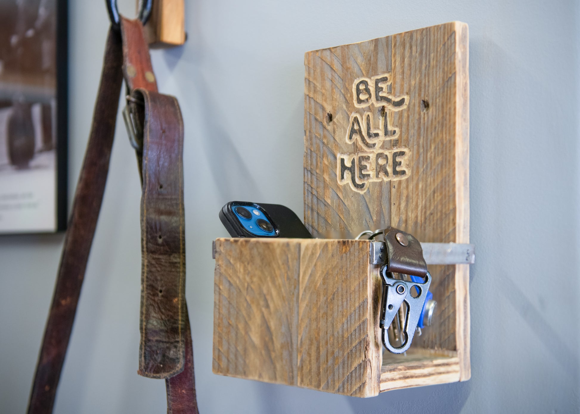 Recycled from pallets, this easy-install wall box is purposed to give your phone a break, and serve as a reminder that in all the busy, wherever your “here” is, to be present, to “Be All Here.”