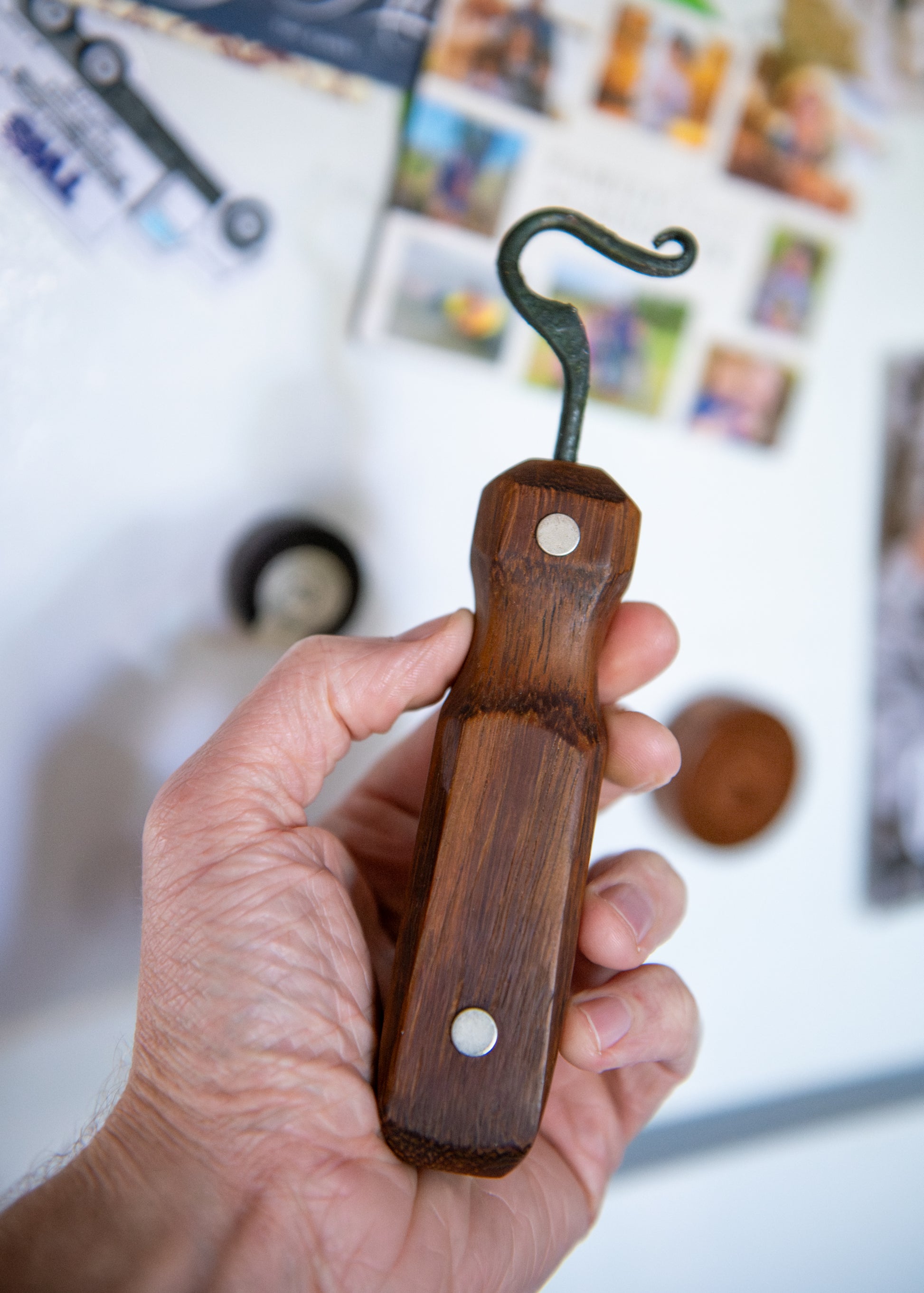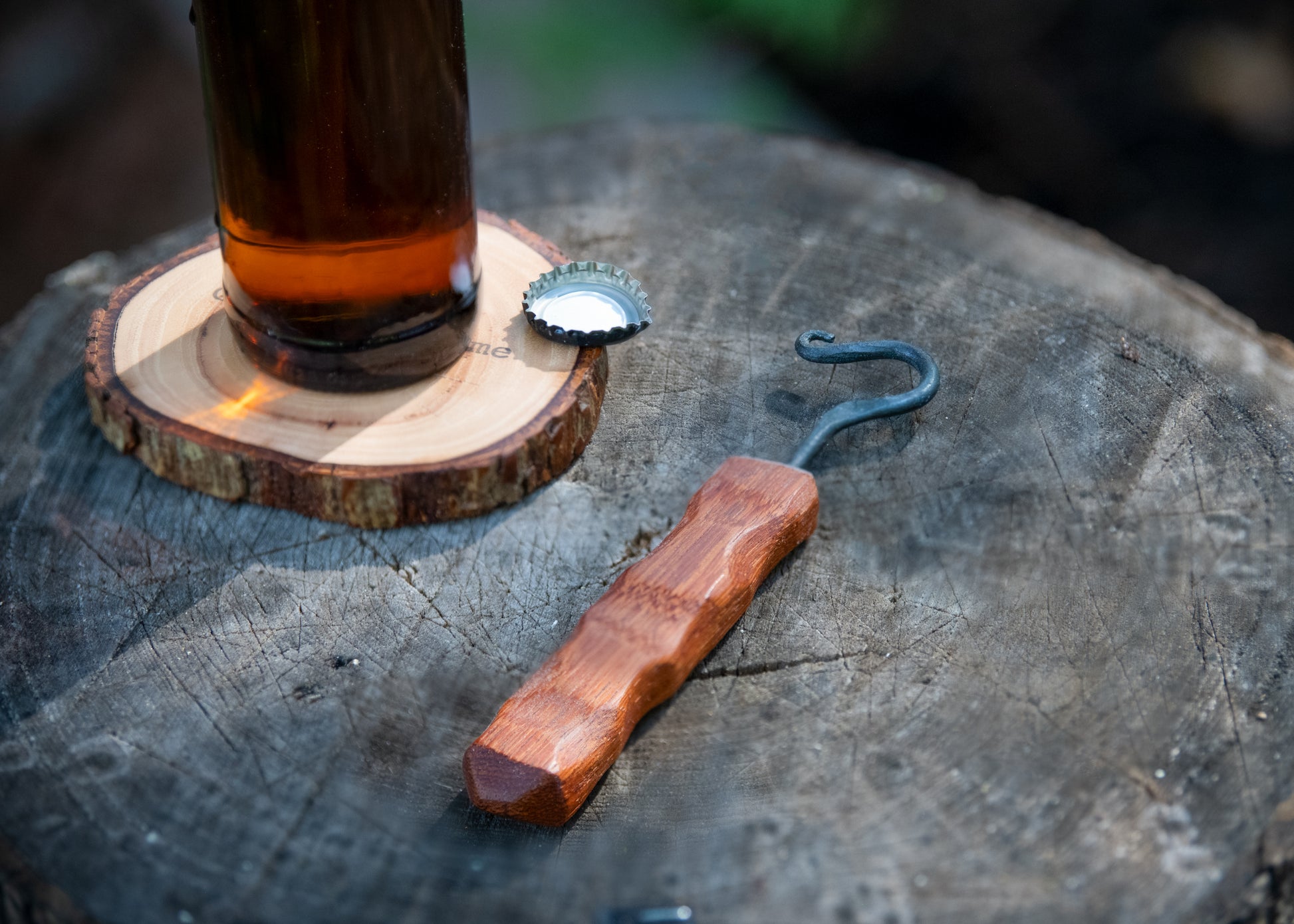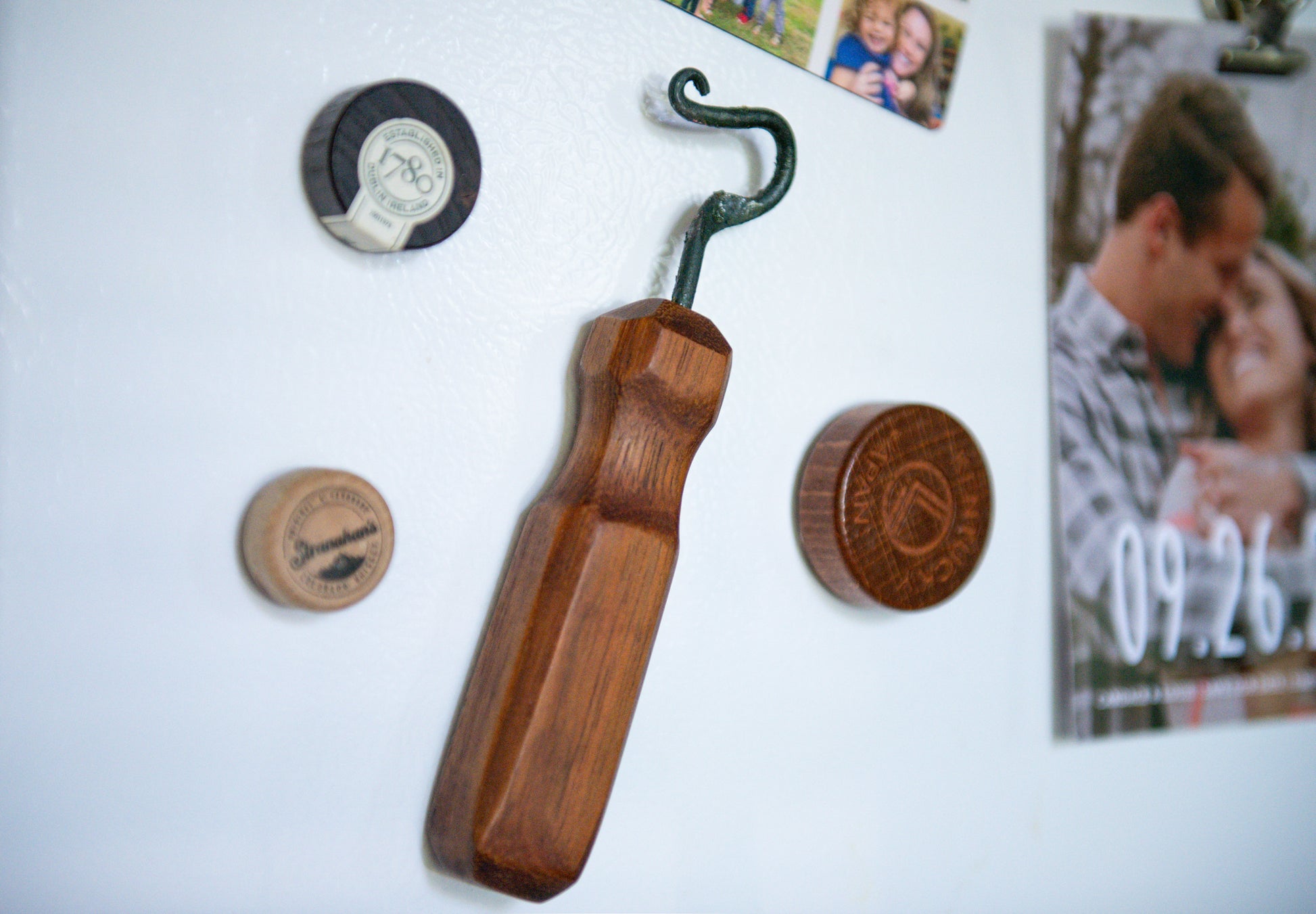 Made with custom blacksmithed hardware, and equipped with strong magnets, these beautifully handled, hardwood bottle-openers make for a strong addition to any man-cave or kitchen